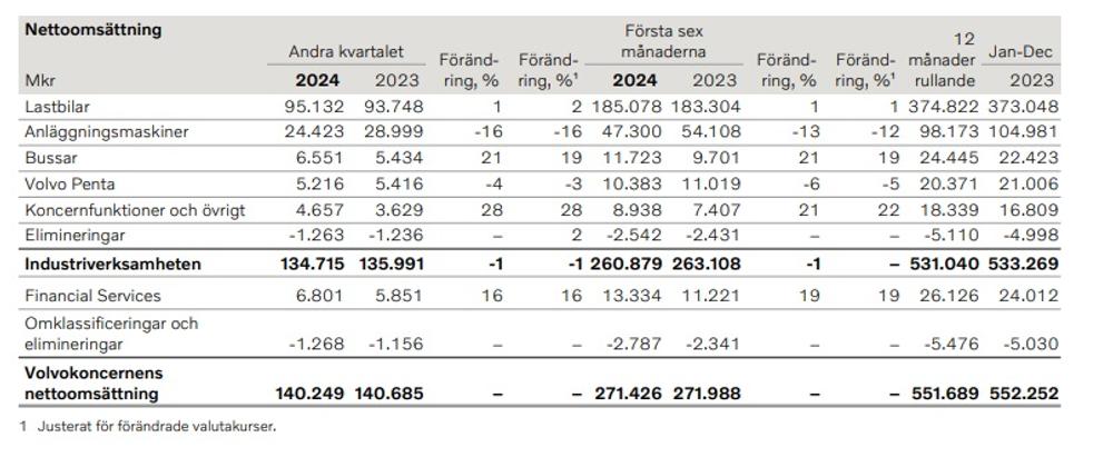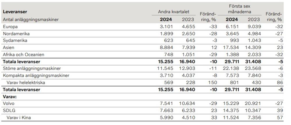 Vad gäller Volvos anläggningsmaskiner rapporterar man att nettoomsättningen minskat med 16 procent, att maskinförsäljningen minskat med 19 procent och att serviceförsäljningen ökat med två procent under det andra kvartalet.