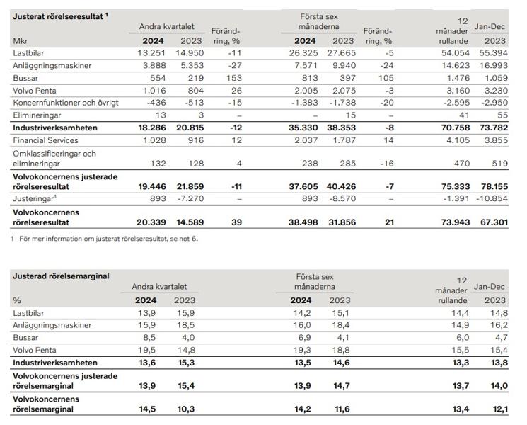 Volvokoncernen rapporterar om ”god lönsamhet” under årets andra kvartal, med en nettoomsättning på drygt 140 miljarder kronor och ett justerat rörelseresultat på 19,4 miljarder kronor (att jämföra med 21,9 miljarder under samma period 2023).